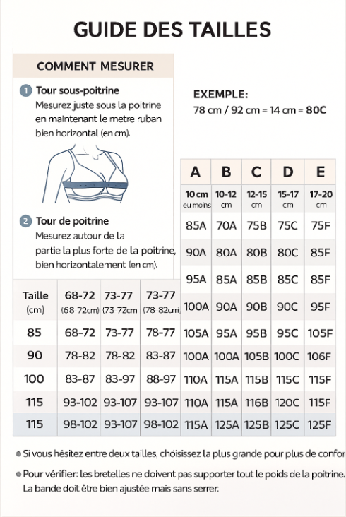 Consultez notre tableau des tailles pour trouver la coupe idéale. Les bretelles et le dos sont réglables, permettant un ajustement sur mesure. Si vous hésitée entre deux tailles, choisissez la plus grande pour plus de confort.